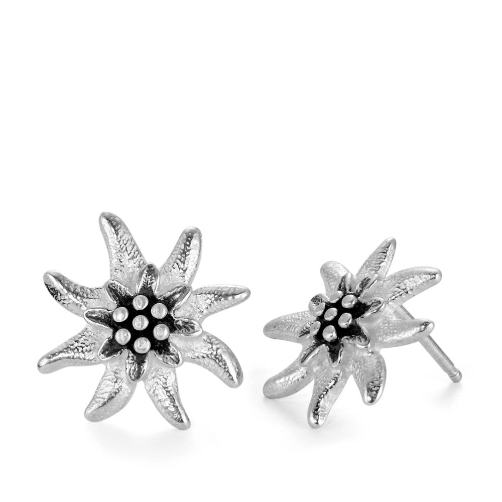 Elegante Damen Ohrstecker aus hochwertigem Silber, gestaltet als filigranes Edelweiss. Das zeitlose Design symbolisiert Naturverbundenheit und alpine Schönheit. Perfekt für jeden Anlass und ein stilvolles Geschenk für Liebhaberinnen klassischer Schmuckstücke.