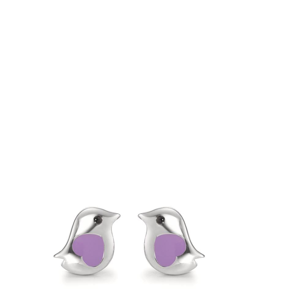Süße Mädchen Ohrstecker aus hochwertigem Silber in Form eines kleinen Vogels. Verziert mit einem lila Herz auf der Brust und einem funkelnden Auge, sind sie das perfekte Accessoire für kleine Schmuckliebhaberinnen. Ideal für jeden Tag oder besondere Anlässe.