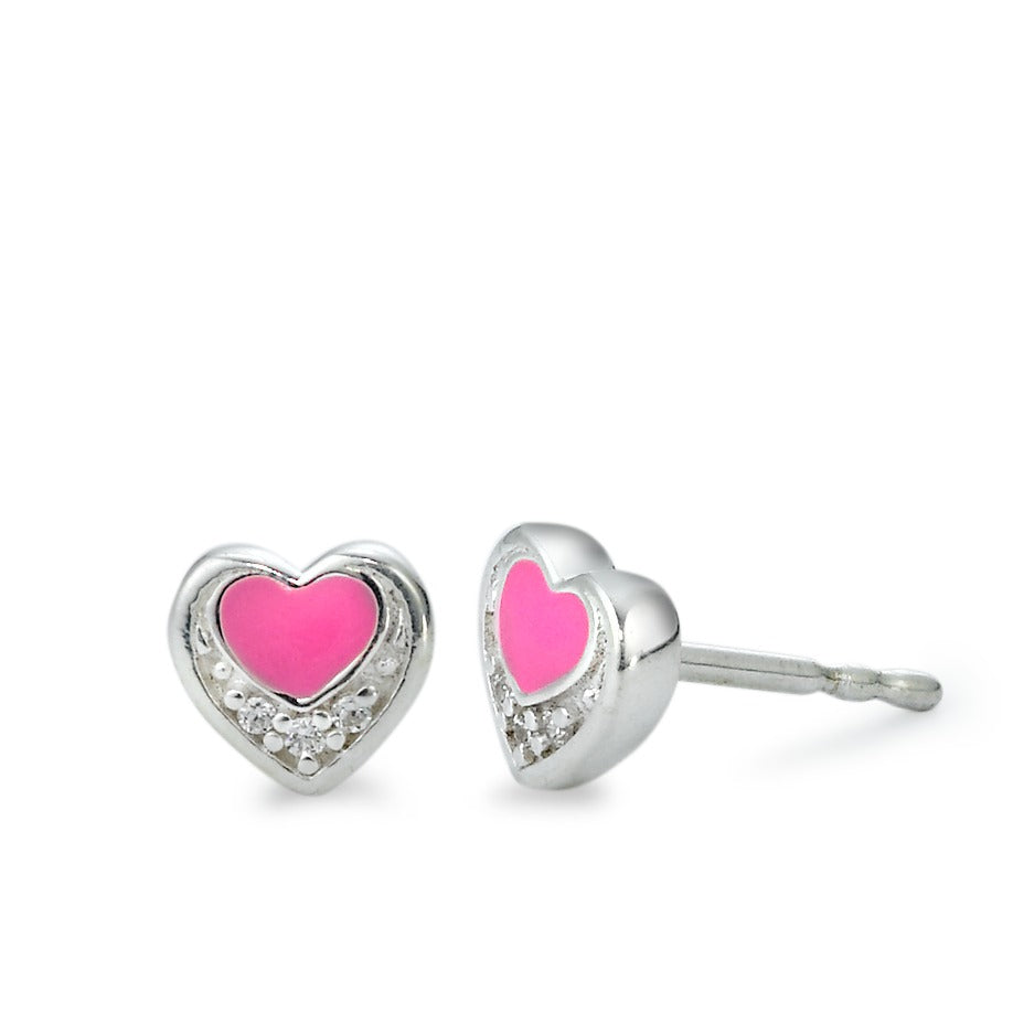 Zauberhafte Mädchen-Ohrstecker aus hochwertigem Silber, mit einem pinkfarbenen Herz und funkelnden Zirkonia-Steinen. Ein zarter und zugleich fröhlicher Ohrschmuck, der jedem kleinen Mädchen Freude bereitet und perfekt zum Verschenken geeignet ist.