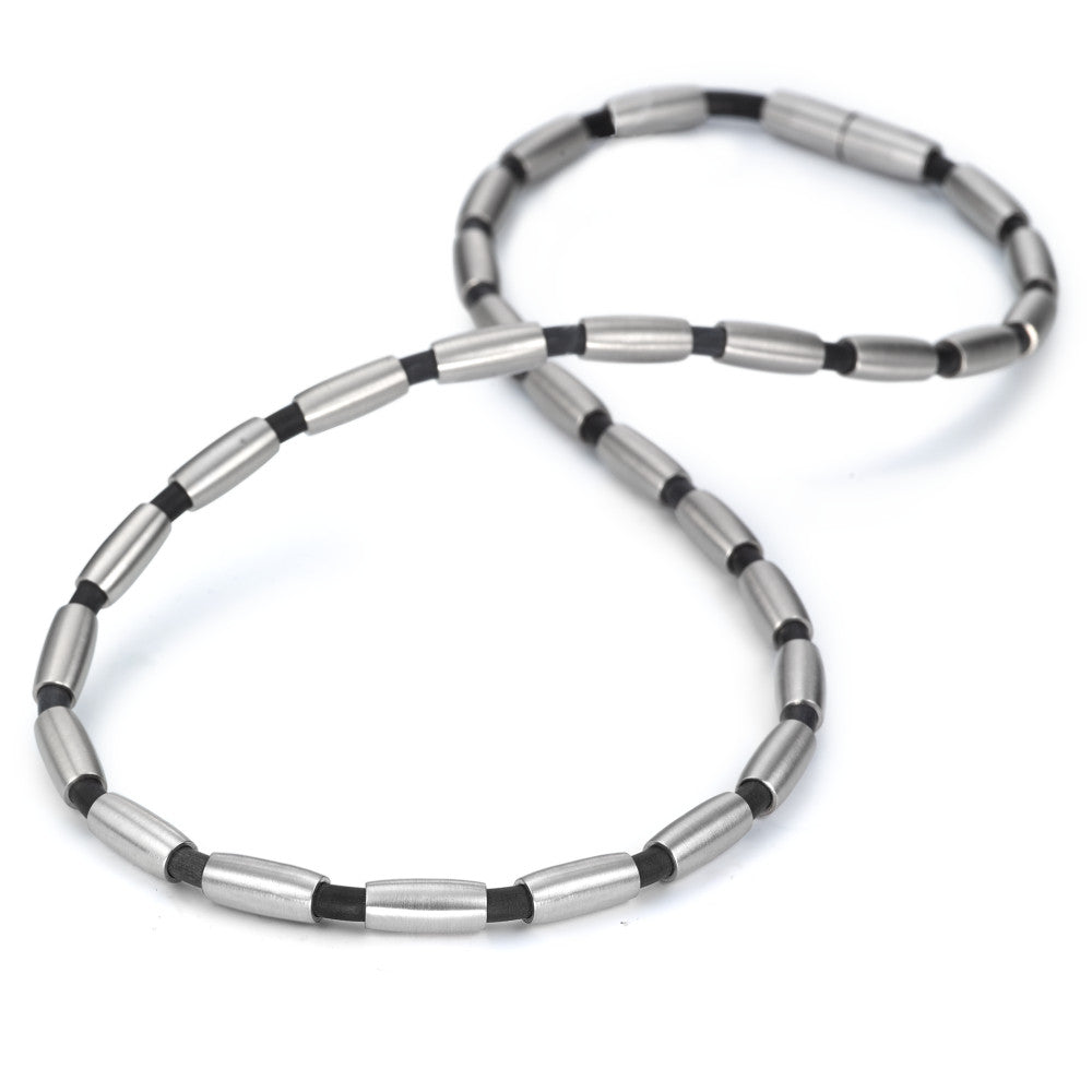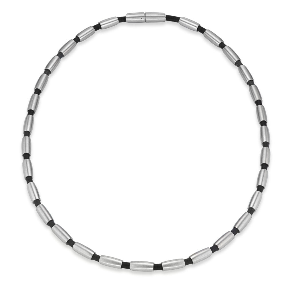 Modernes Collier aus hochwertigem Edelstahl und flexiblem Kautschuk. Die silberfarbenen Edelstahl-Röhrchen setzen coole Akzente, während das schwarze Kautschukband für Komfort und Langlebigkeit sorgt. Ein maskulines Accessoire für jeden Anlass, das Stil und Robustheit vereint.