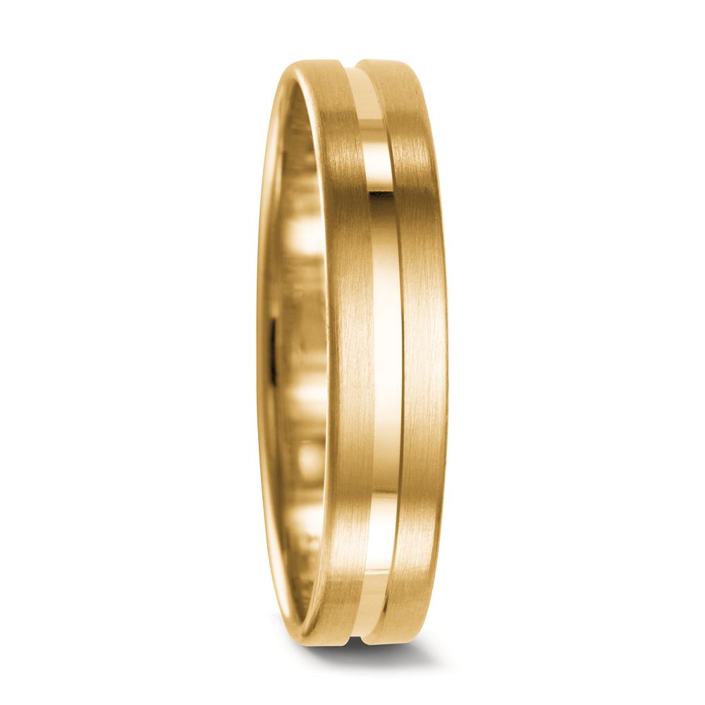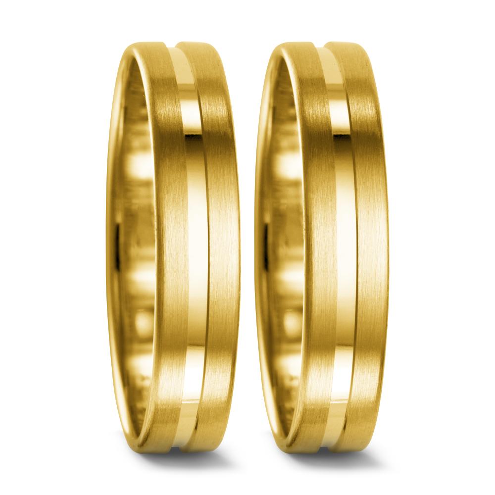 Eleganter Partnerring aus hochwertigem 750er Gelbgold. Mit mattem Finish und einem glänzenden Streifen in der Mitte vereint dieser Ring zeitlose Eleganz und moderne Schlichtheit – das perfekte Symbol für Ihre Partnerschaft und gemeinsame Verbundenheit.