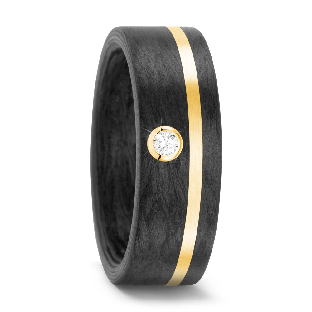Moderner Damen-Partnerring aus mattem 750 Gelbgold mit einer eleganten Carbon-Oberfläche. Verziert mit einem strahlenden Diamanten, der für glanzvollen Akzent sorgt. Ein einzigartiges Schmuckstück, das Stil und Individualität perfekt vereint.