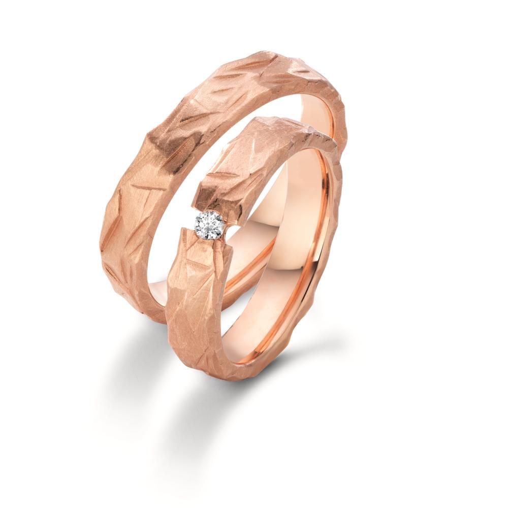 Eleganter Partnerring aus 750er Rotgold mit einzigartiger, facettierter Oberfläche. Das moderne Design verleiht dem Ring eine besondere Ausstrahlung und macht ihn zum perfekten Symbol für Ihre Liebe und Verbundenheit. Hochwertige Verarbeitung garantiert langlebigen Tragekomfort.