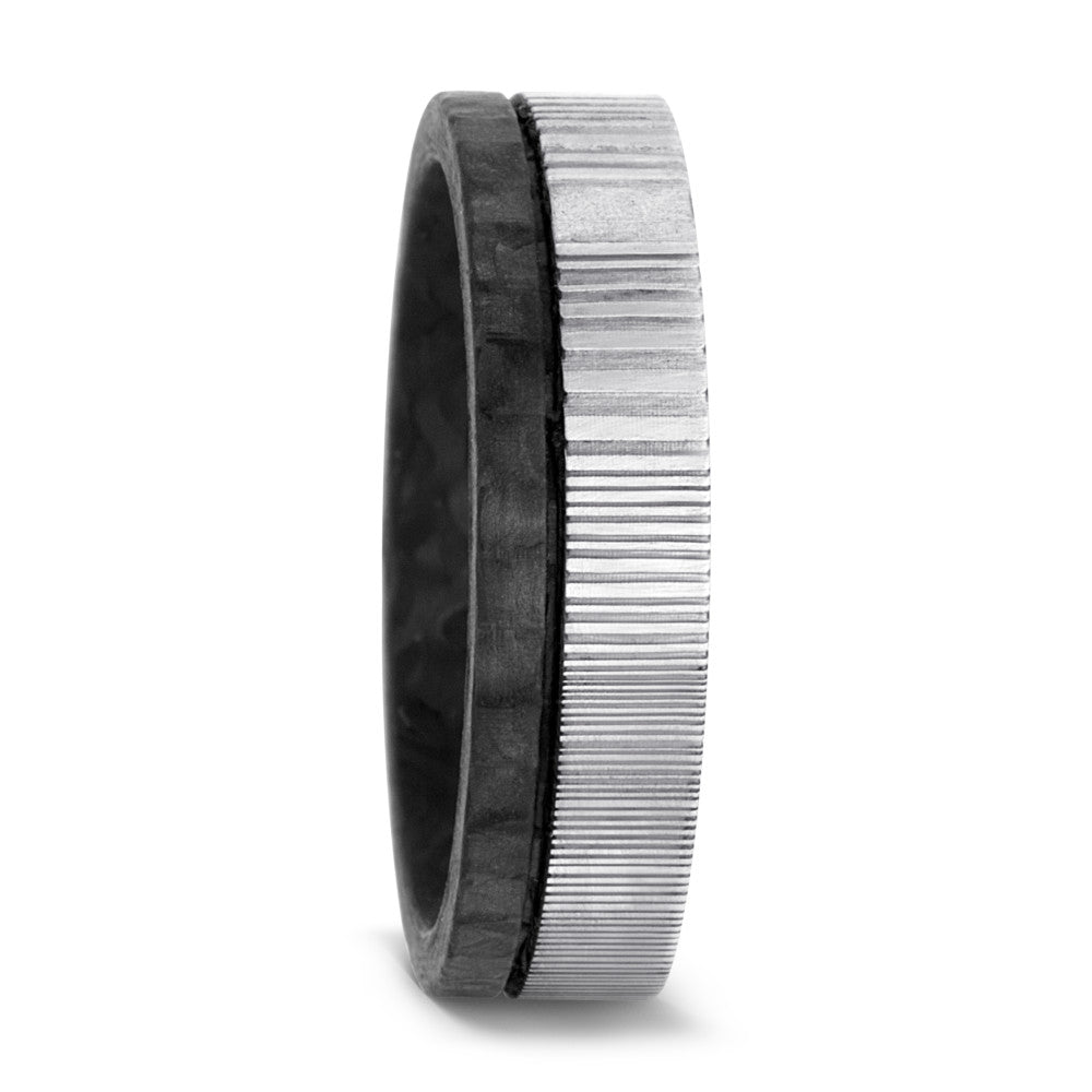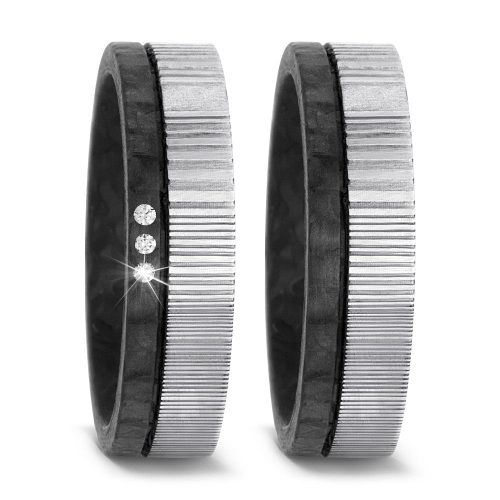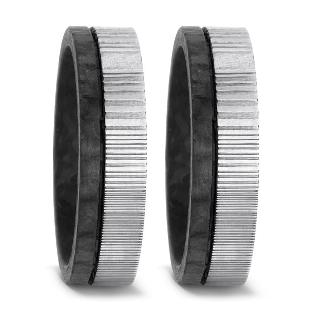 Moderner Partnerring aus hochwertigem Damaszener Stahl und Carbon. Das einzigartige Design kombiniert die robuste Eleganz von Stahl mit der leichten, matten Optik des Karbon. Perfekt für stilbewusste Paare, die Individualität und Qualität schätzen.