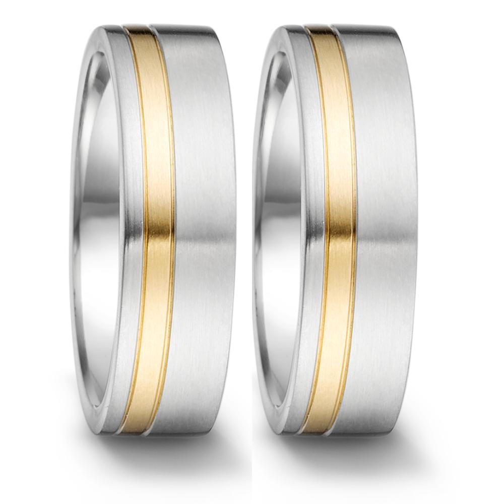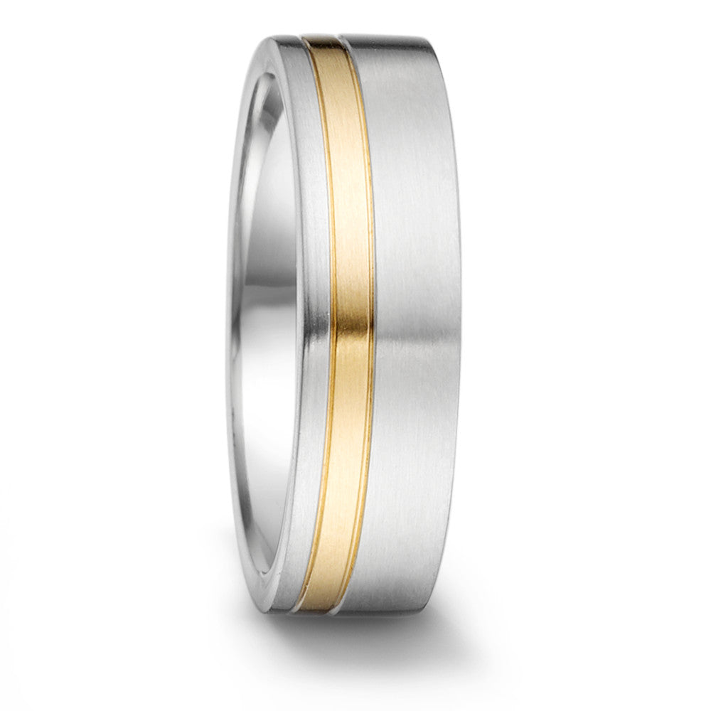 Eleganter Partnerring aus hochwertigem Edelstahl mit einem edlen Streifen aus 750er Gelbgold. Das moderne Design vereint zeitlose Eleganz und Alltagstauglichkeit, perfekt für Paare, die klassische und robuste Schmuckstücke lieben. Ein Symbol für Ihre Verbundenheit.