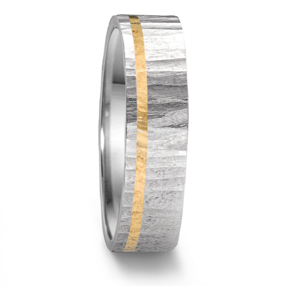 Dieser Partnerring verbindet robustes Edelstahl mit edlem 750er Gelbgold in einer stilvollen, gehämmerten Optik. Die Kombination aus elegantem Gelbgoldstreifen und mattierter Edelstahloberfläche verleiht dem Ring ein modernes und zugleich zeitloses Design – perfekt für echte Partnerschaften.