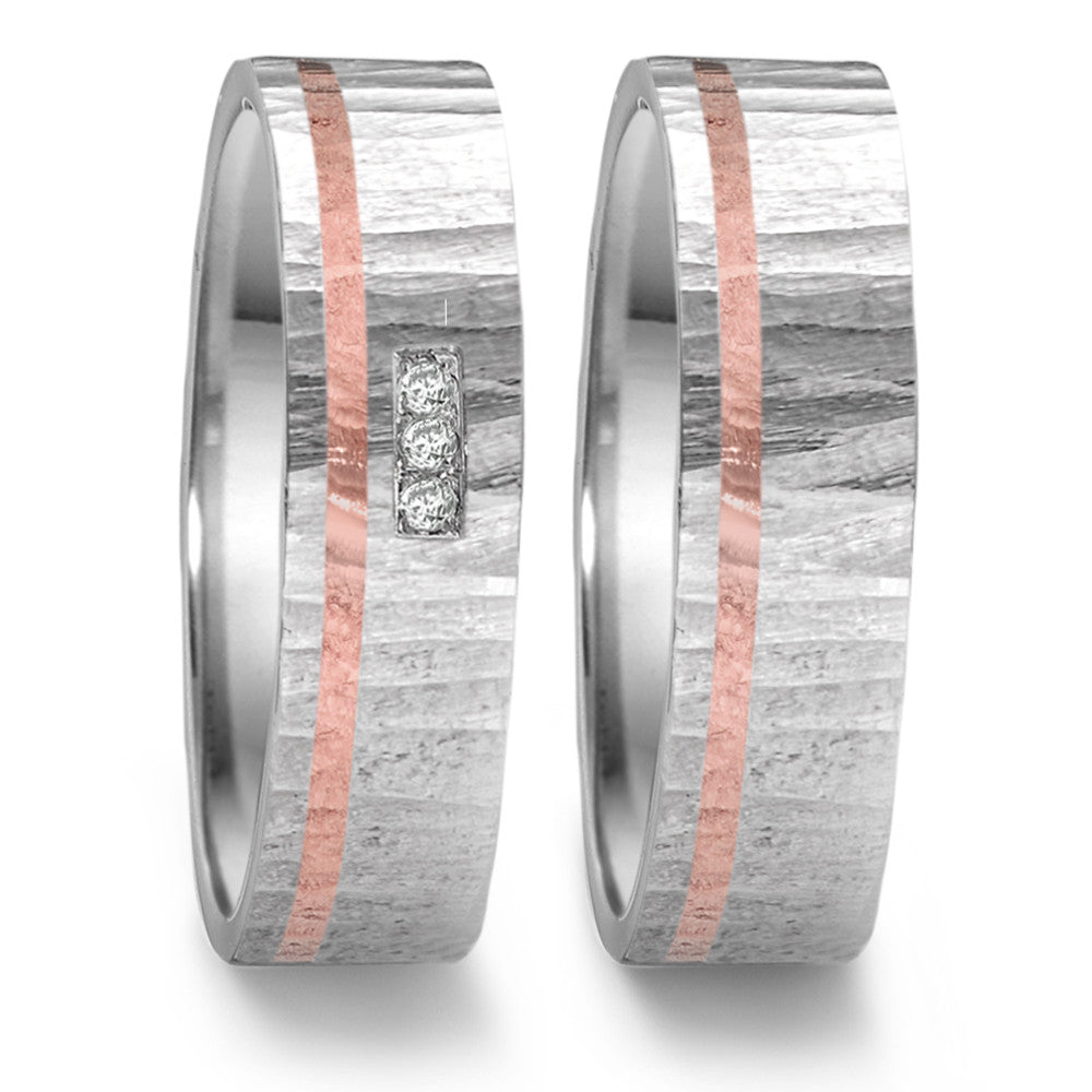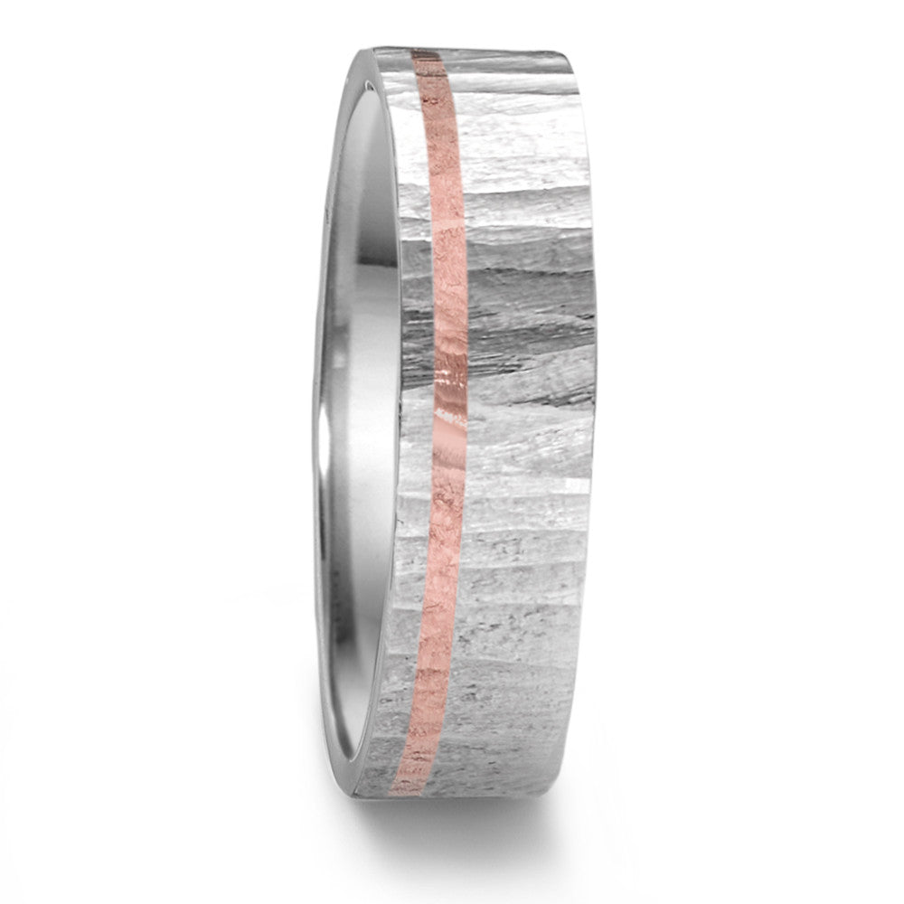 Eleganter Partnerring aus robustem Edelstahl mit einem charmanten Akzent aus 750er Rotgold. Die einzigartige strukturierte Oberfläche verleiht dem Ring eine besondere Optik und macht ihn zum perfekten Symbol für Verbundenheit und Stil. Ideal für Paare, die zeitlose Eleganz schätzen.