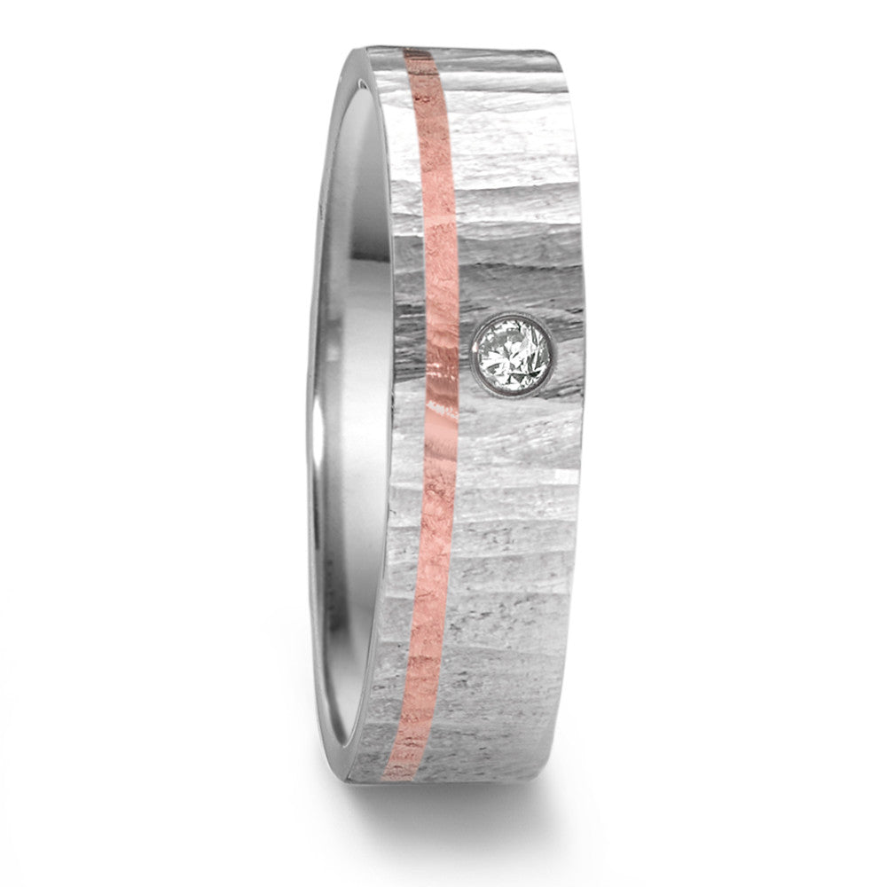 Eleganter Damen-Partnerring aus robustem Edelstahl mit matt gehämmerter Oberfläche. Veredelt durch einen zarten Streifen aus 750er Rotgold und einen funkelnden Diamanten, vereint dieses Schmuckstück zeitlose Schönheit mit moderner Eleganz – perfekt für besondere gemeinsame Momente.