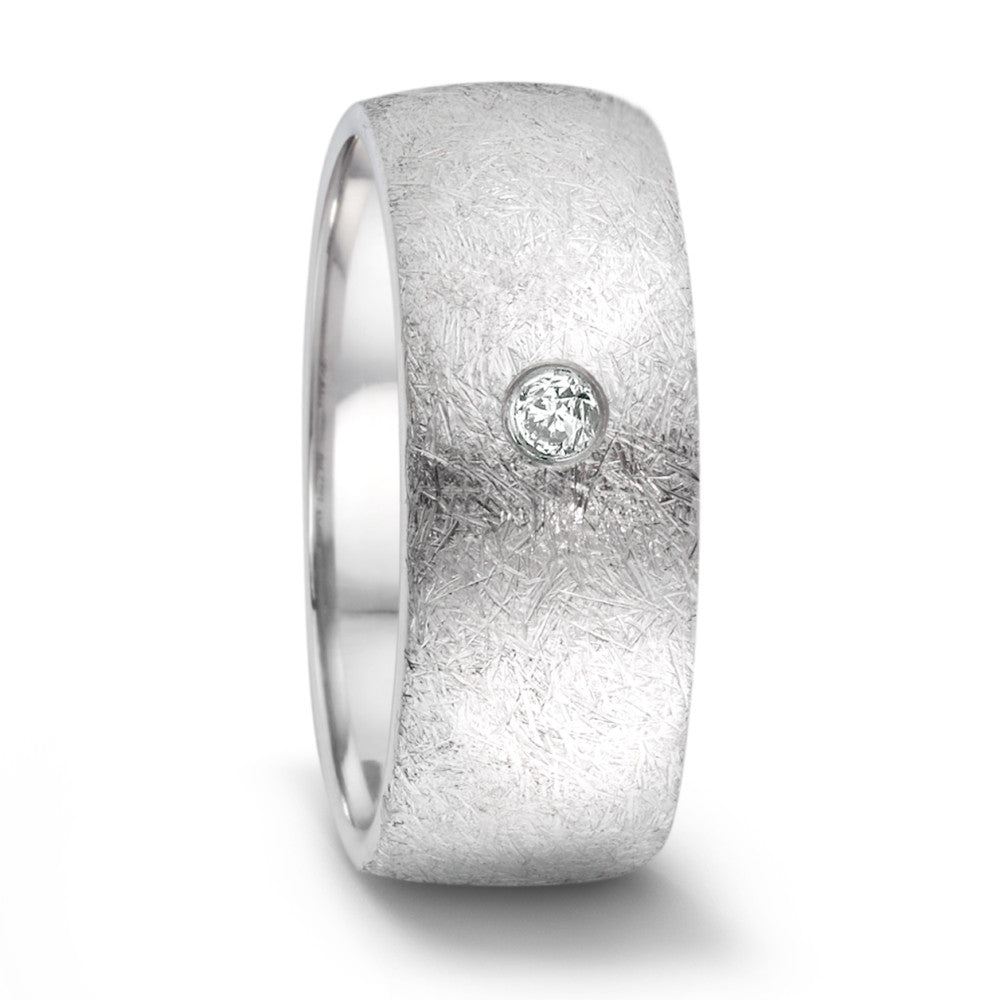 Eleganter Damen-Partnerring aus hochwertigem Edelstahl mit matter Oberfläche und einem funkelnden Diamanten. Der zeitlose Schmuck verbindet Robustheit mit dezentem Luxus – perfekt für besondere Momente und die symbolische Verbindung zweier Herzen.