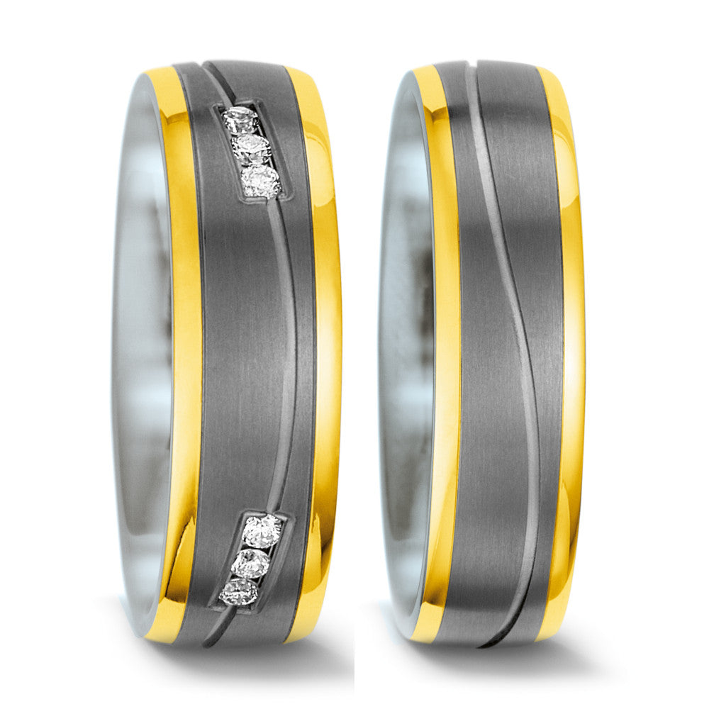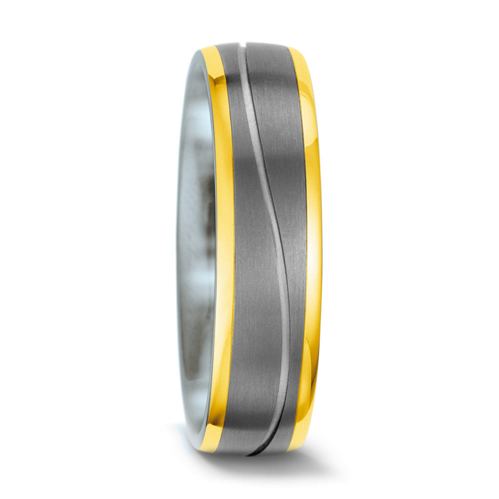 Eleganter Partnerring aus robustem Titan kombiniert mit warmem 585er Gelbgold. Das moderne Design besticht durch einen dezenten Wellenfalz und klare Linien. Perfekt für Paare, die zeitlose & beständige Liebe stilvoll symbolisieren möchten.