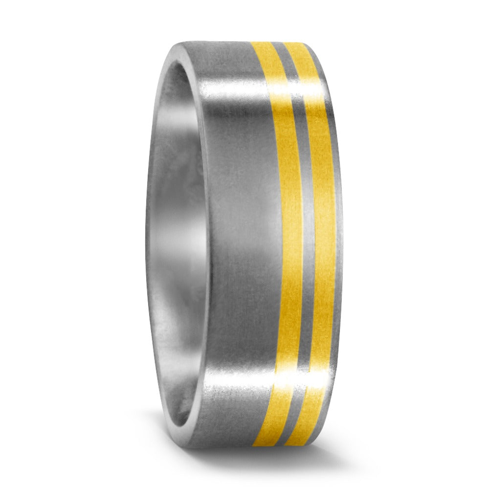 Moderner Partnerring aus robustem Titan, veredelt mit zwei eleganten Streifen aus 750er Gelbgold. Die Kombination aus mattiertem Titan und warmem Gold schafft einen stilvollen Kontrast. Perfekt für Paare, die Qualität und Design schätzen. Zeitlos und langlebig für den Alltag.