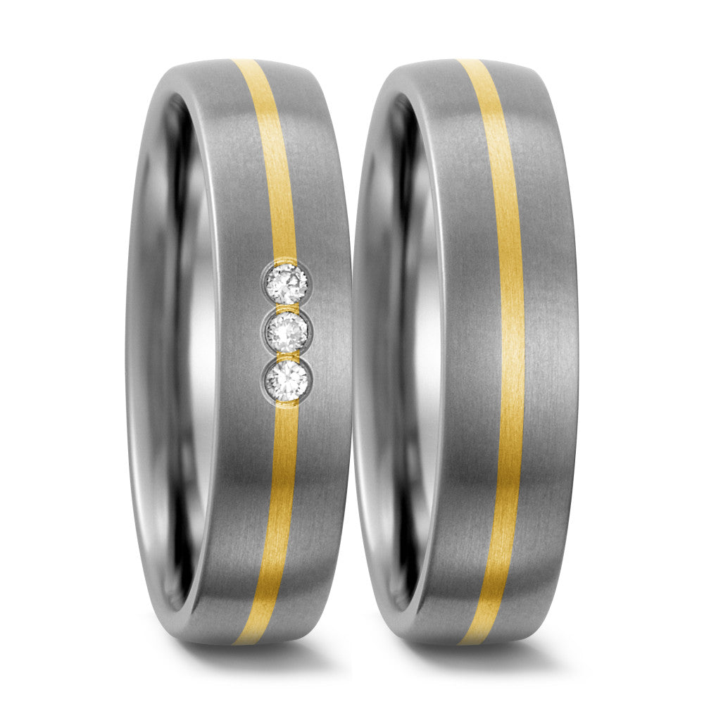 Moderner Partnerring aus robustem Titan mit elegantem Inlay aus 750er Gelbgold. Die matte Oberfläche und der feine Goldstreifen verleihen diesem Ring eine zeitlose und stilvolle Note – perfekt für den besonderen Moment. Hochwertig, langlebig und angenehm zu tragen.