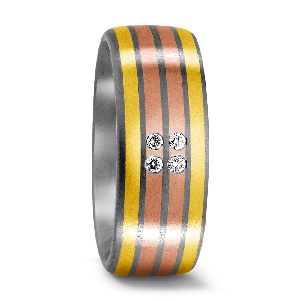 Dieser elegante Damen Partnerring vereint Titan mit 750er Gelb- und Rotgold in einem modernen Streifendesign. Vier funkelnde Diamanten setzen edle Akzente und machen den Ring zum perfekten Symbol für Liebe und Partnerschaft. Robust, stilvoll und zeitlos schön.