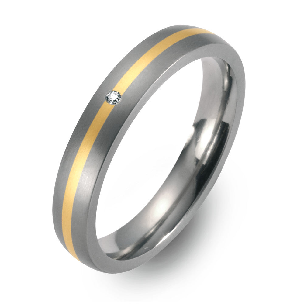Eleganter Damen-Partnerring aus robustem Titan mit einem edlen Streifen aus 750er Gelbgold. Ein funkelnder Diamant setzt ein stilvolles Highlight. Perfekt für besondere Momente und als symbolisches Schmuckstück für die Ewigkeit. Komfortabel und zeitlos schön.