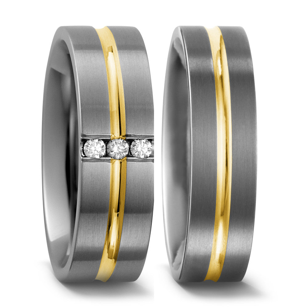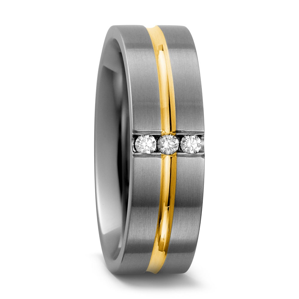 Eleganter Damen-Partnerring aus robustem Titan mit einer edlen 750 Gelbgold-Intarsie. Drei funkelnde Diamanten verleihen diesem modernen Ring zeitlose Schönheit und besonderen Glanz. Perfekt als Symbol für Liebe und Verbundenheit.