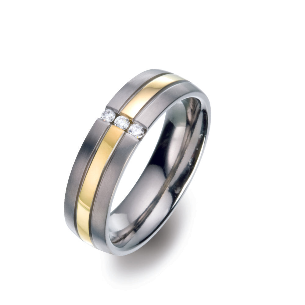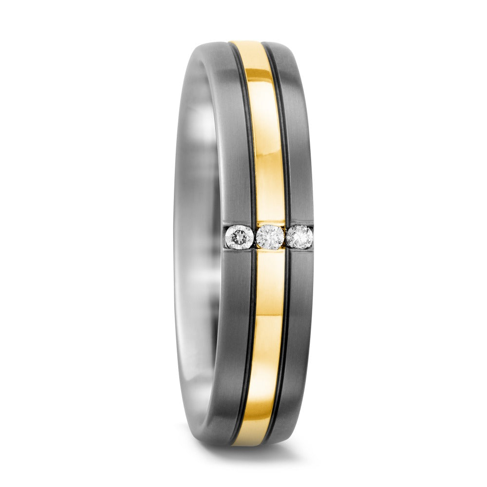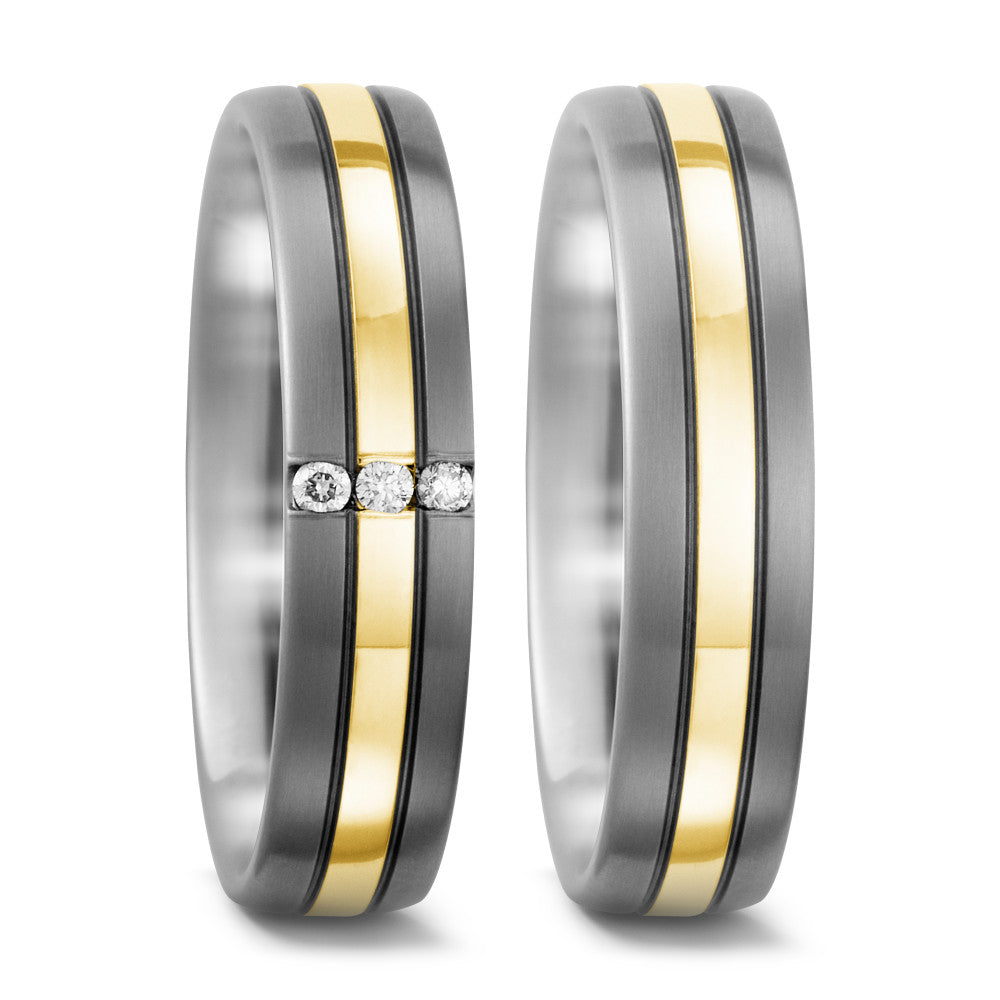 Eleganter Damen-Partnerring aus robustem Titan mit einem edlen Streifen aus 750 Gelbgold. Drei funkelnde Diamanten verleihen dem Schmuckstück zeitlose Schönheit und exklusiven Glanz. Perfekt für besondere Momente und die symbolische Verbindung zweier Herzen.