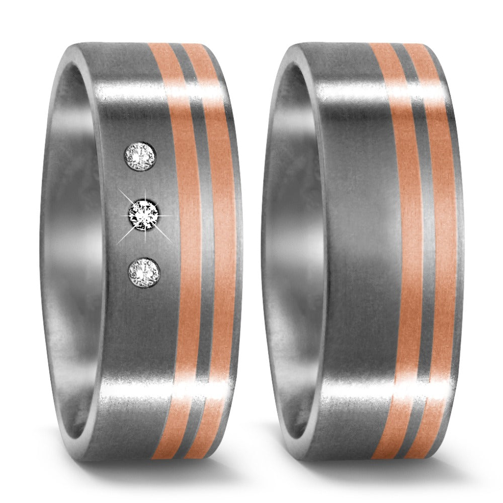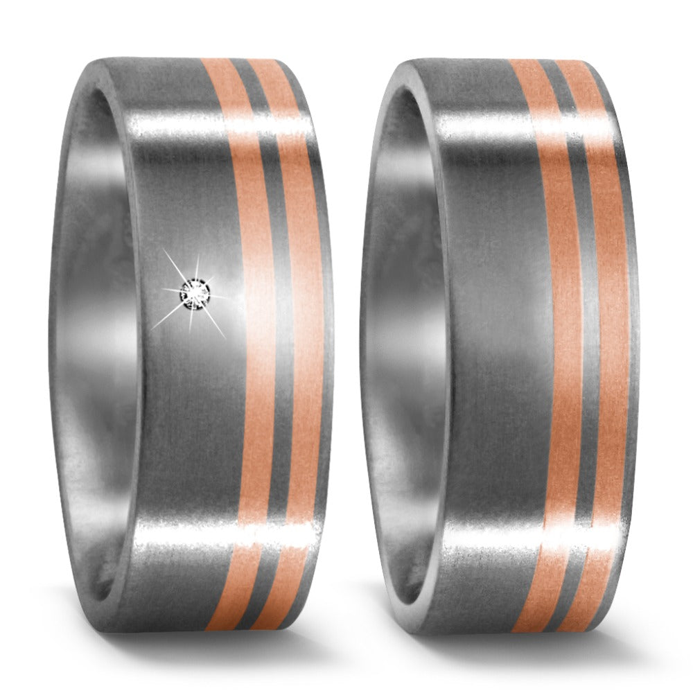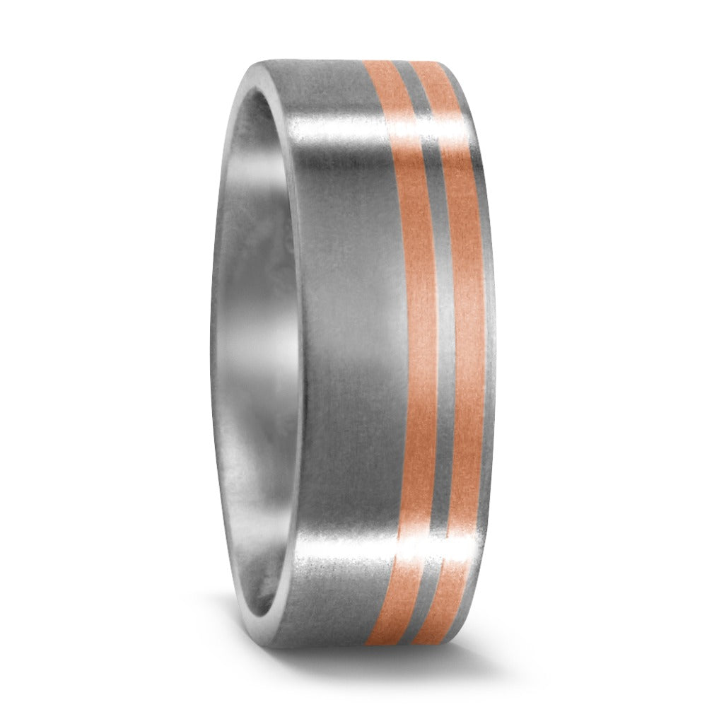 Moderner Partnerring aus hochwertigem Titan, veredelt mit zwei eleganten Streifen aus 750er Rotgold. Das matte Titan steht im stilvollen Kontrast zum warmen Glanz des Rotgolds und macht dieses Schmuckstück zu einem zeitlosen Symbol Ihrer Verbindung. Robust und edel zugleich.
