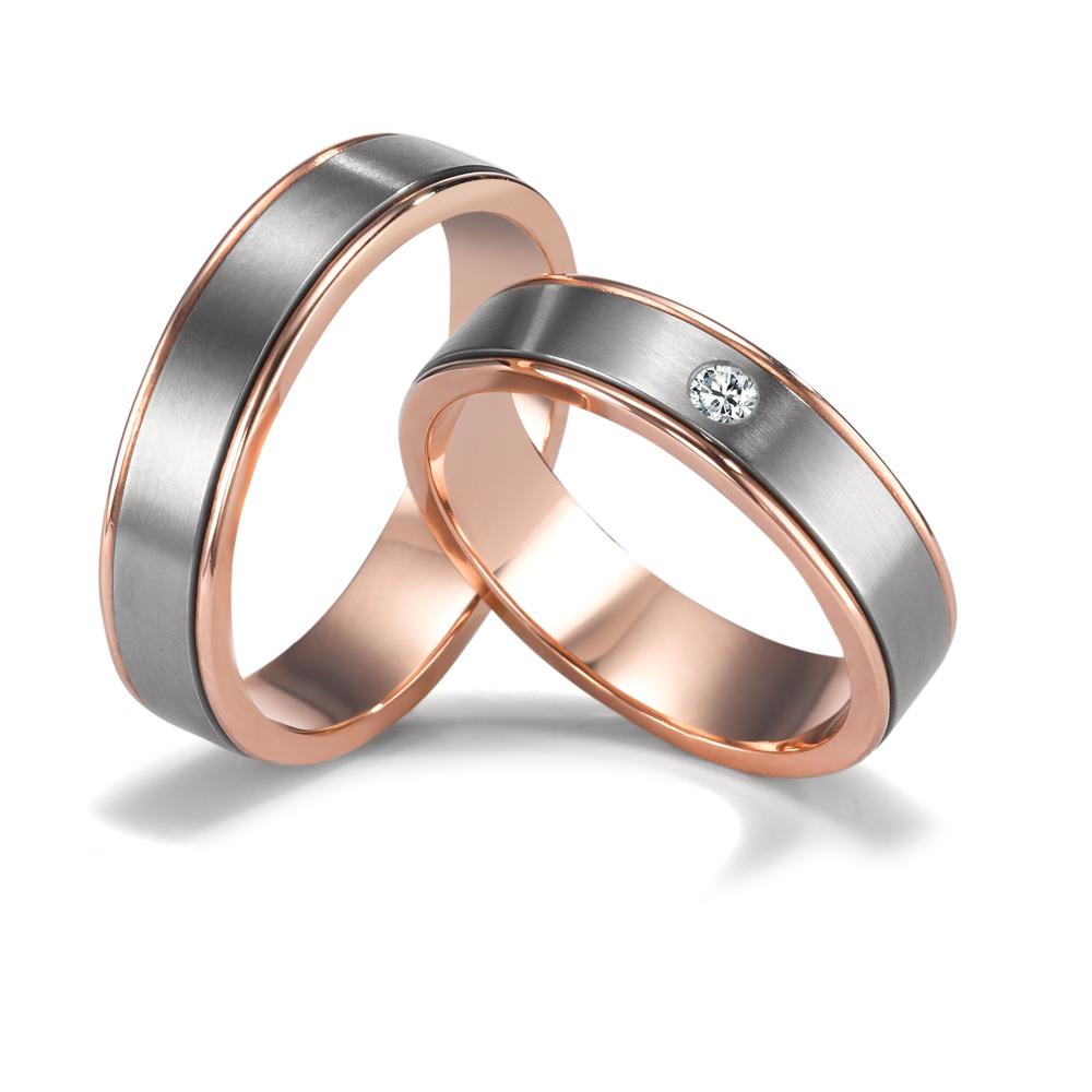 Moderner Partnerring aus robustem Titan mit eleganten Applikationen aus 750er Rotgold. Dieses edle Schmuckstück vereint zeitlose Ästhetik und außergewöhnliche Widerstandsfähigkeit – perfekt für Paare, die Stil und Beständigkeit schätzen.