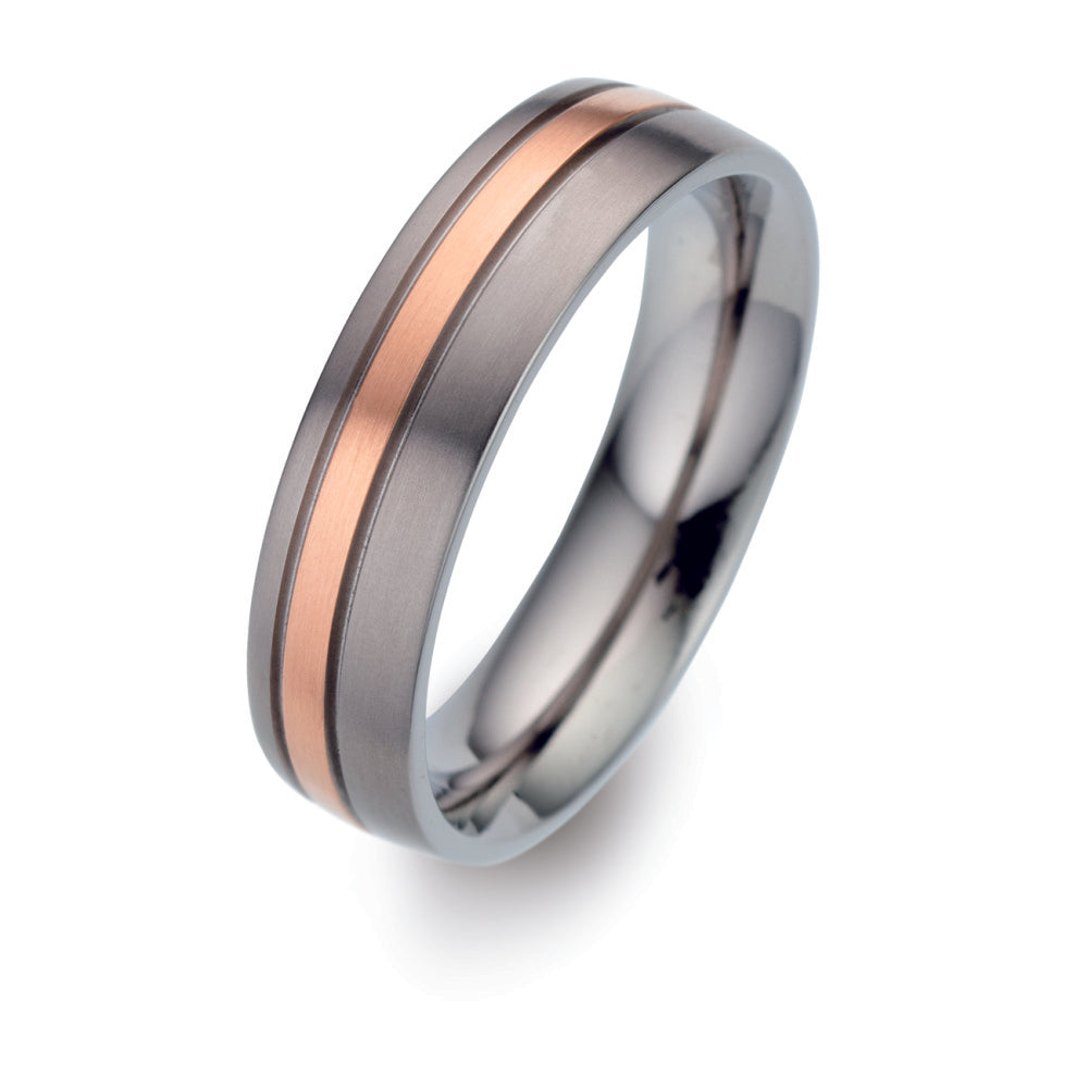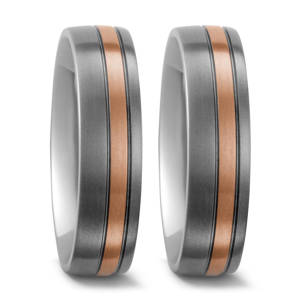 Moderner Partnerring aus robustem Titan mit elegantem Mittelstreifen aus hochwertigem 750er Rotgold. Das zeitlose Design kombiniert Strapazierfähigkeit und edlen Glanz – perfekt für Paare, die Wert auf stilvolle Langlebigkeit legen. Ein Symbol für ewige Verbundenheit.