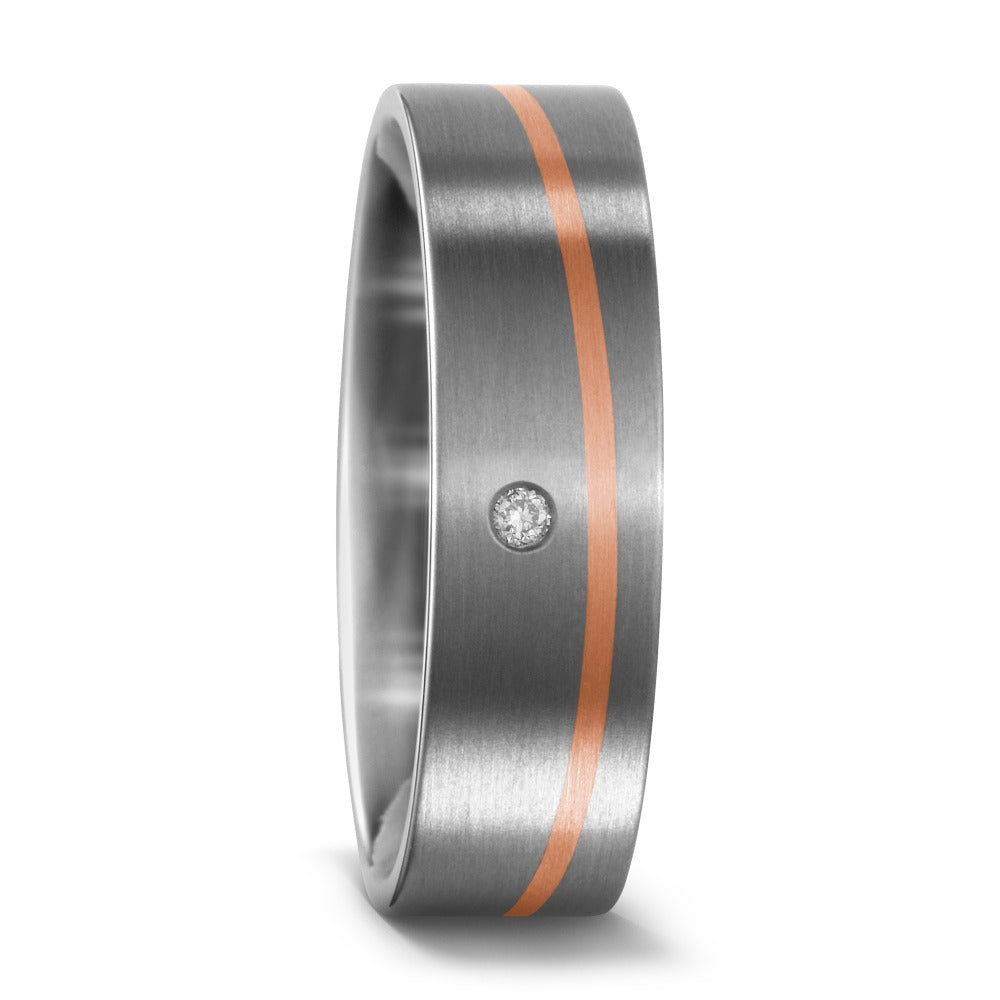 Moderner Damen-Partnerring aus hochwertigem Titan mit eleganter 750er Rotgold-Einlage. Ein funkelnder Diamant verleiht dem Ring eine besondere Note. Perfekt für Paare, die zeitlose Qualität und stilsichere Akzente schätzen. Robust, angenehm zu tragen und edel im Design.