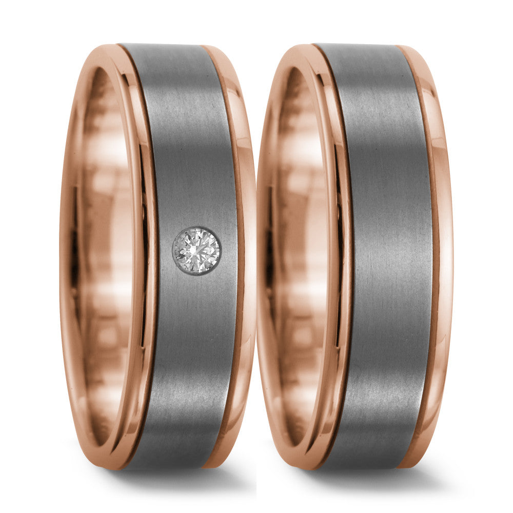 Eleganter Damen-Partnerring aus robustem Titan mit edlem 750 Rotgold-Rand. Der Ring besticht durch einen funkelnden Diamanten in der Mitte und vereint zeitlose Schönheit mit moderner Eleganz – perfekt für besondere Momente und bleibende Verbundenheit.