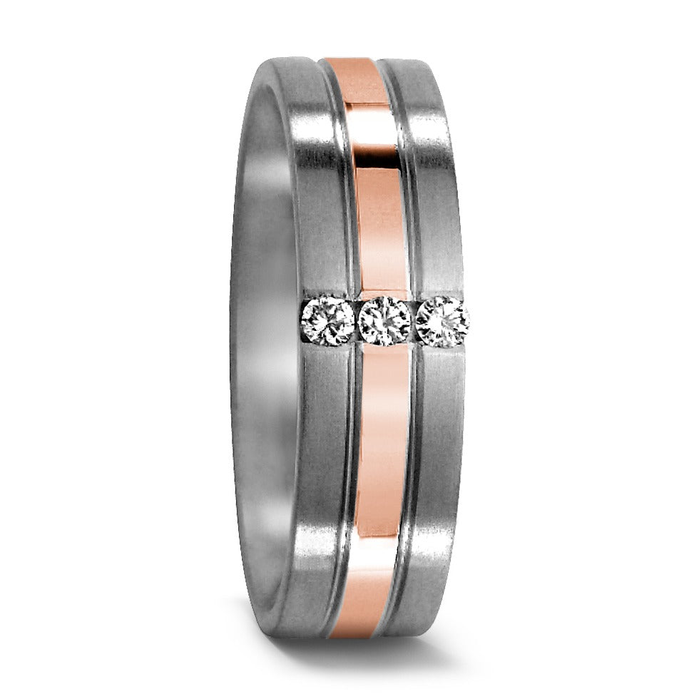 Dieser elegante Damen Partnerring vereint robustes Titan mit einem edlen Streifen aus 750er Rotgold. Drei funkelnde Diamanten setzen stilvolle Akzente und verleihen dem zeitlosen Design besonderen Glanz. Perfekt für ein symbolträchtiges Schmuckstück voller Liebe.