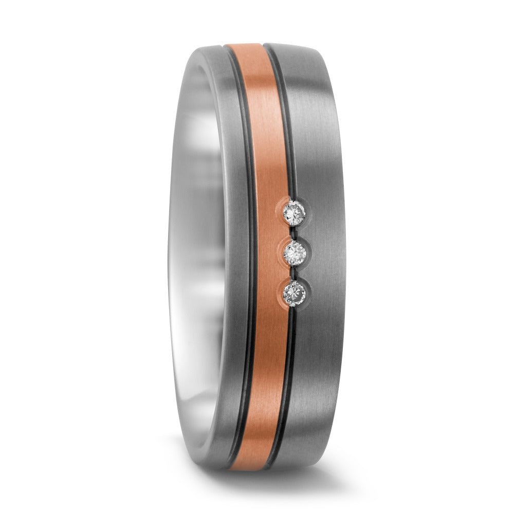 Eleganter Damen-Partnerring aus robustem Titan mit edlem 750er Rotgold in der Mitte. Drei funkelnde Diamanten setzen glanzvolle Akzente und verleihen dem Ring zeitlose Schönheit. Perfekt als Ausdruck ewiger Verbundenheit und stilvolles Schmuckstück für jeden Tag.