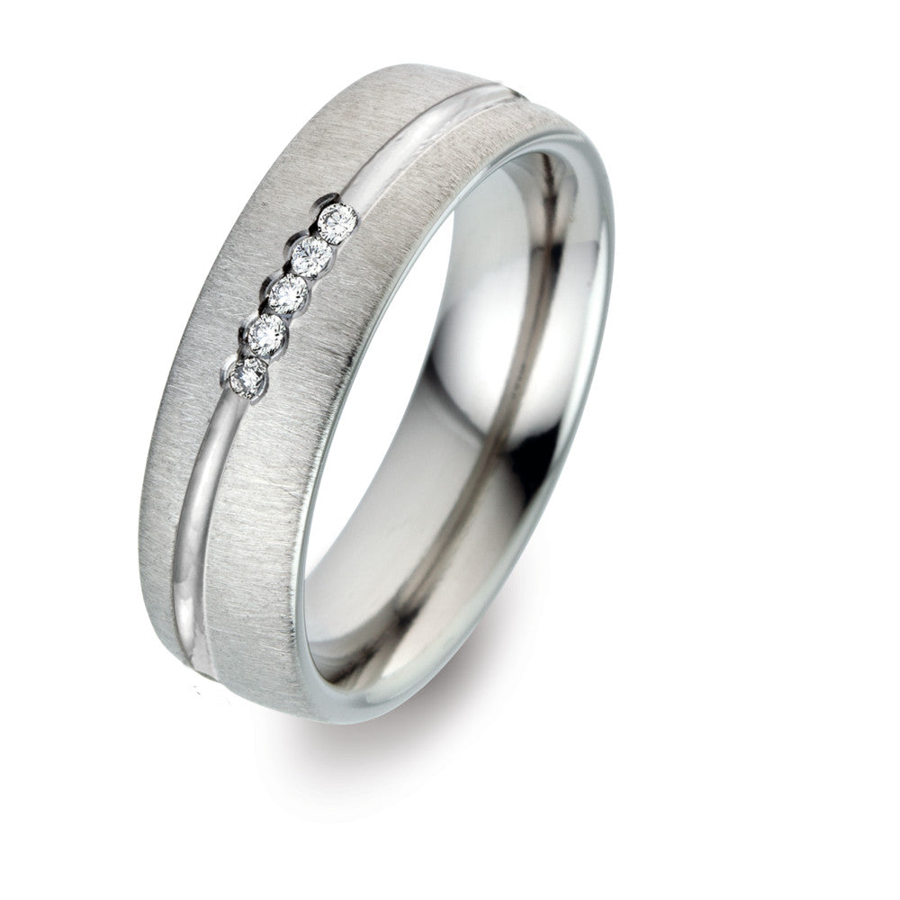 Eleganter Damen-Partnerring aus hochwertigem Titan mit fünf funkelnden Diamanten. Das moderne Design mit matter Oberfläche und feiner Linienführung macht diesen Ring zu einem zeitlosen Symbol für Liebe und Verbundenheit. Perfekt für besondere Momente.