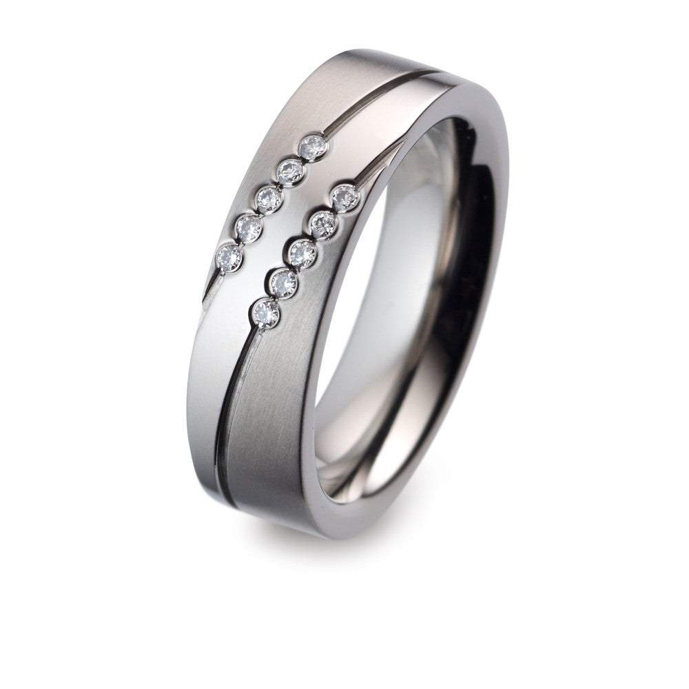 Eleganter Damen-Partnerring aus robustem Titan mit einer matten und polierten Oberfläche. Verziert mit funkelnden Diamanten, die dem Ring einen edlen und zeitlosen Charme verleihen. Perfektes Symbol für Verbundenheit und Liebe, ideal für besondere Anlässe.