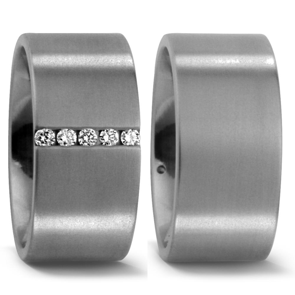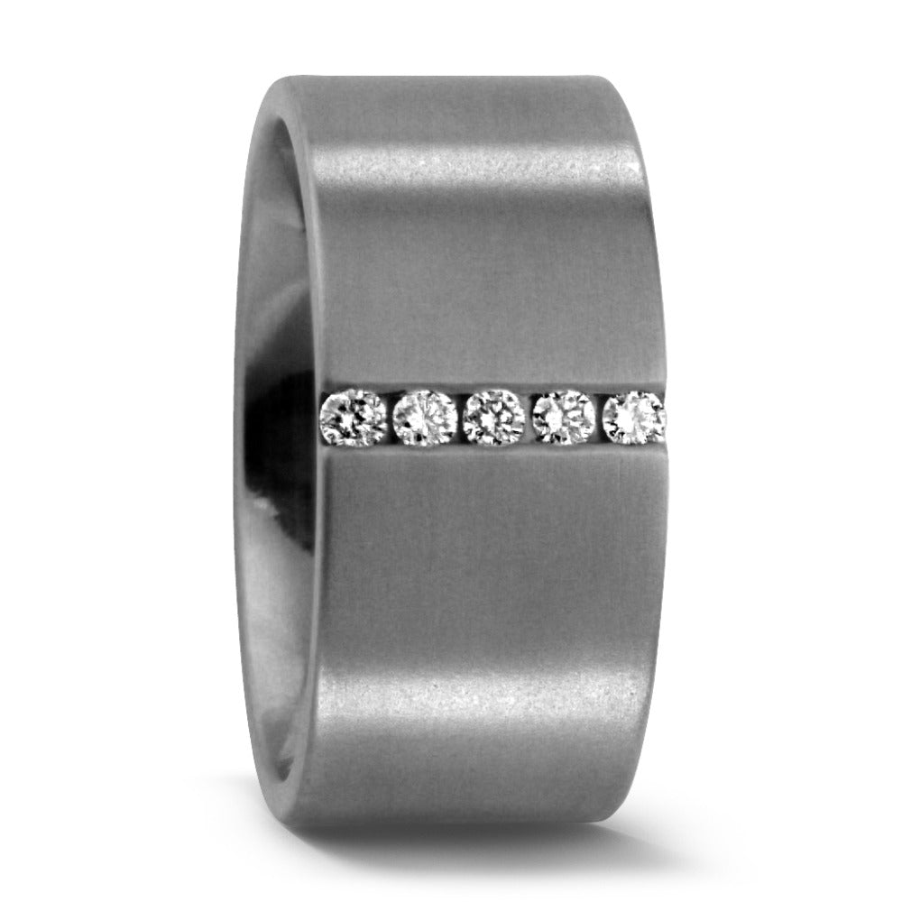 Moderner Damen-Partnerring aus robustem Titan mit mattem Finish. Der breite Ring ist mit fünf funkelnden Diamanten besetzt, die eleganten Glanz und Stil verleihen. Perfekt für zeitlose Eleganz und als Symbol für Verbundenheit. Hochwertig und langlebig.