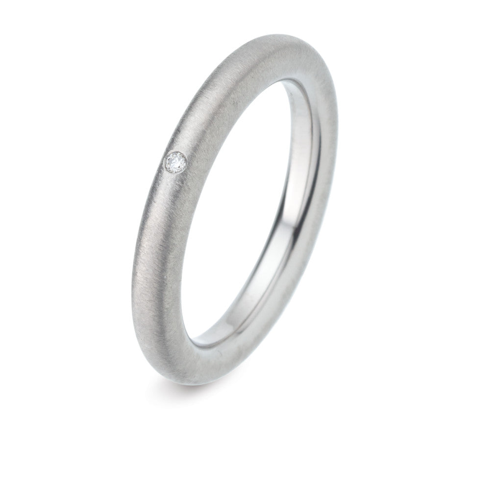 Eleganter Damen Partnerring aus robustem Titan mit feiner, matter Oberfläche. Ein kleiner, funkelnder Diamant setzt einen dezenten, edlen Akzent. Perfekt für stilbewusste Frauen, die zeitlose Eleganz mit moderner Schlichtheit verbinden möchten.
