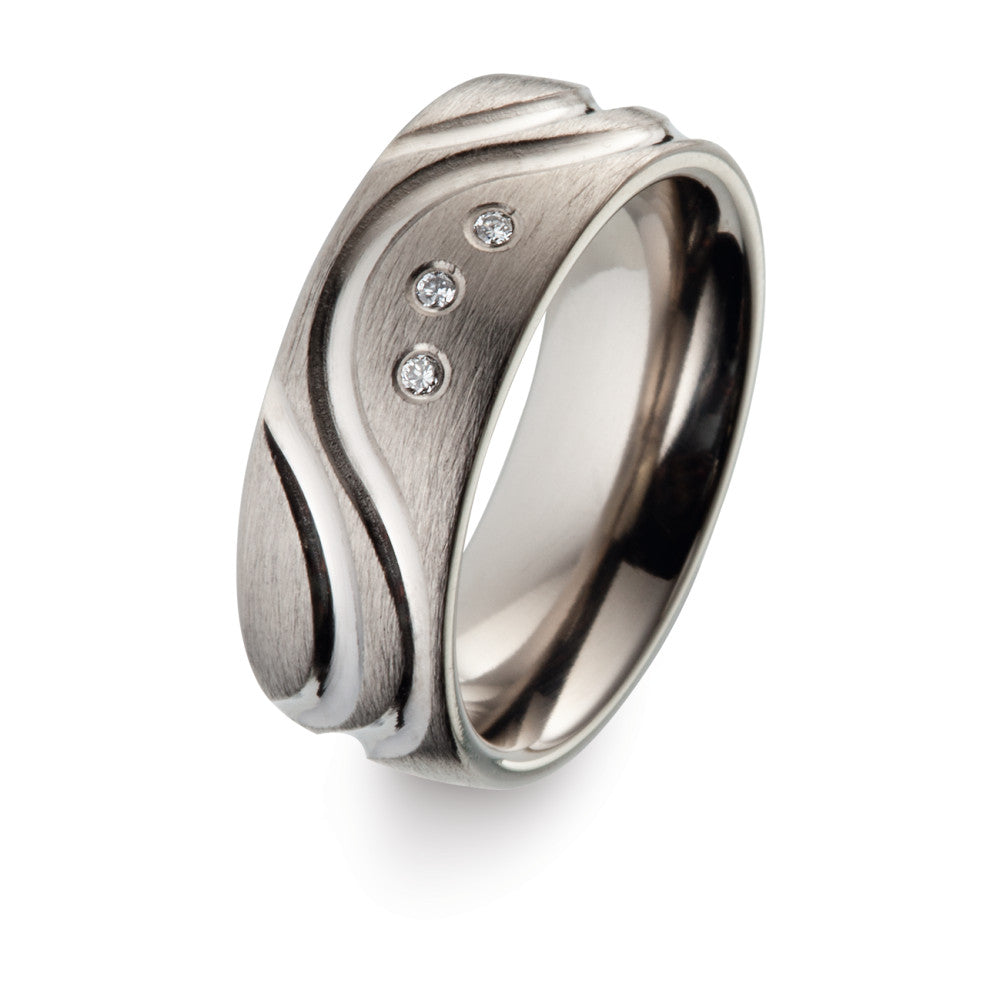 Eleganter Damen-Partnerring aus robustem Titan mit drei funkelnden Diamanten. Das design mit geschwungenen Linien verleiht dem Ring eine moderne und stilvolle Note – perfekt für besondere Momente und als Symbol der Liebe und Verbundenheit.