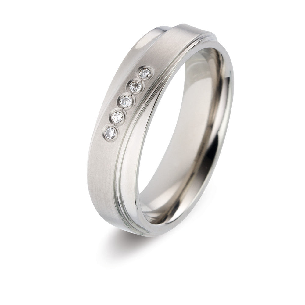 Eleganter Damen-Partnerring aus hochwertigem Titan mit fünf funkelnden Diamanten. Das moderne Design kombiniert mattierte und polierte Oberflächen harmonisch und steht für zeitlose Eleganz und langlebige Partnerschaft. Ideal als symbolisches Schmuckstück für besondere Momente.