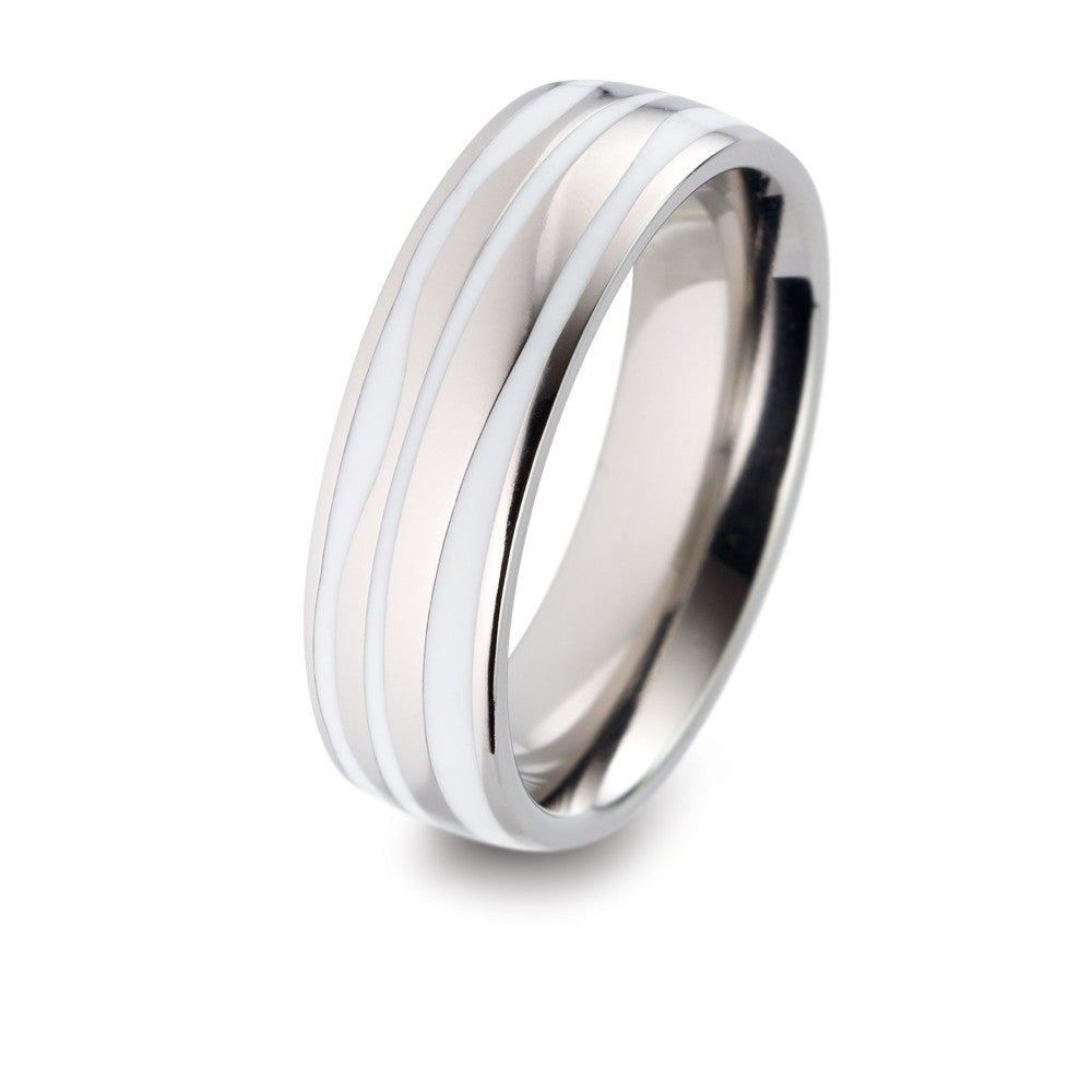 Moderner Partnerring aus robustem Titan mit eleganten weißen Keramikstreifen. Das einzigartige Design verbindet Haltbarkeit mit zeitloser Ästhetik – perfekt für alle, die schlichten Stil und hohe Qualität schätzen. Ein Symbol für Beständigkeit und Verbundenheit.