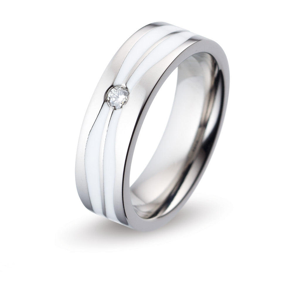 Eleganter Damen-Partnerring aus hochwertigem Titan mit weißer Keramik-Einlage. Veredelt wird das Design durch einen funkelnden Diamanten, der für zeitlose Schönheit sorgt. Perfekt für besondere Momente und die symbolische Verbindung zweier Herzen.