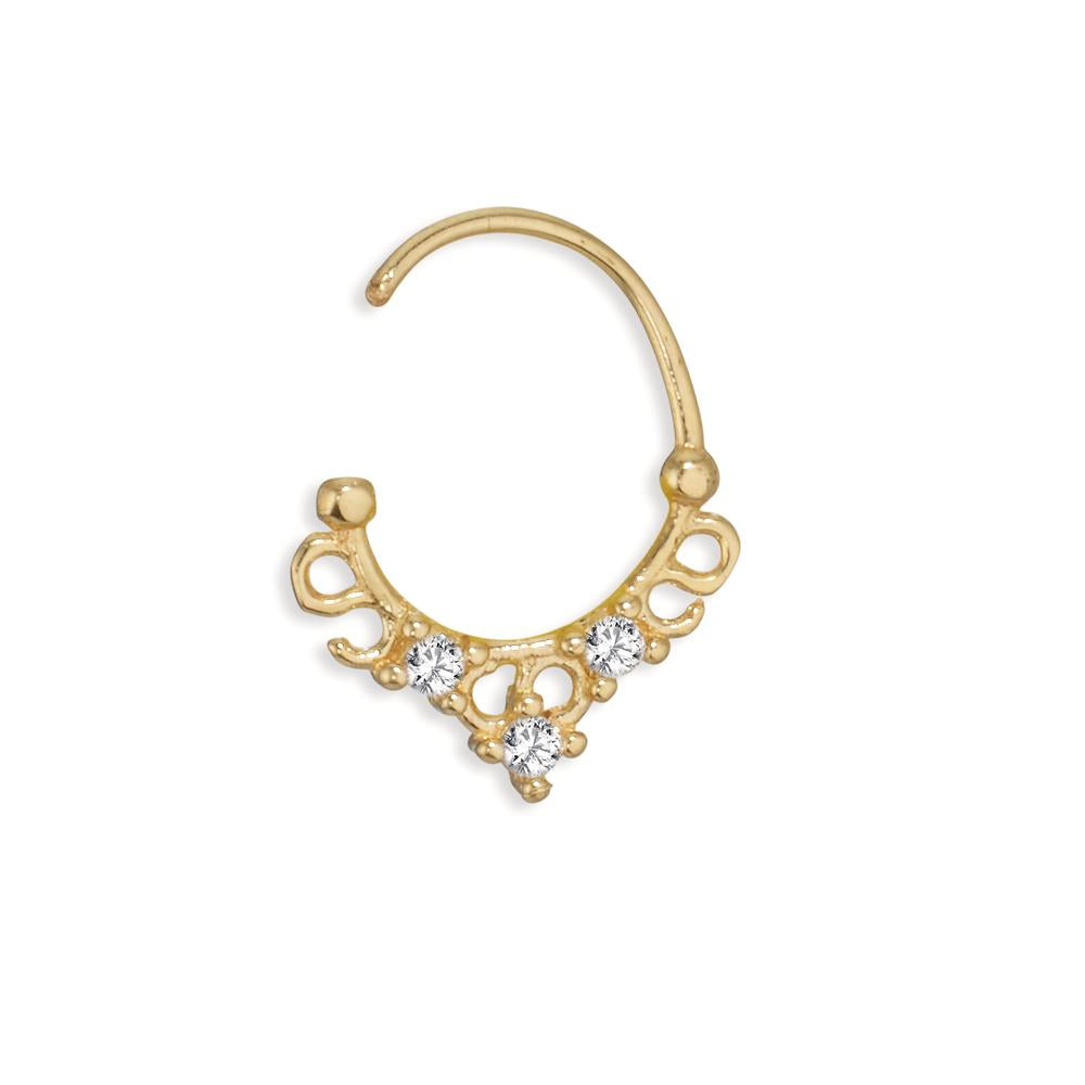 Dieses filigrane Damen-Piercing aus 375 Gelbgold besticht durch seine kunstvolle Verzierung mit drei funkelnden Zirkonia-Steinen. Ein elegantes Accessoire, das jedem Look eine edle und stilvolle Note verleiht. Perfekt für alle, die besondere Details lieben.