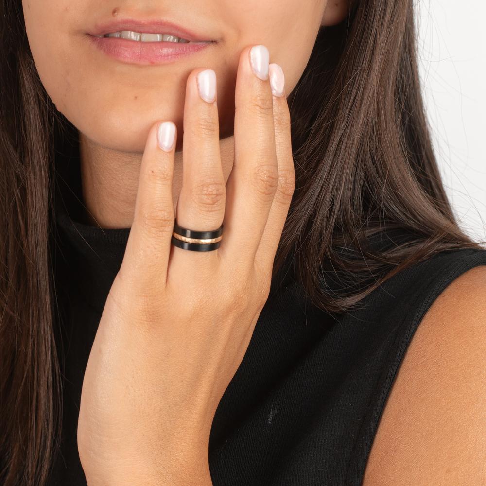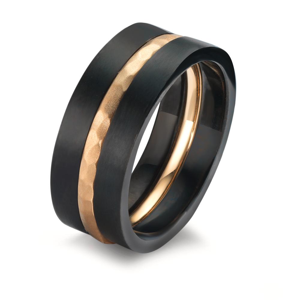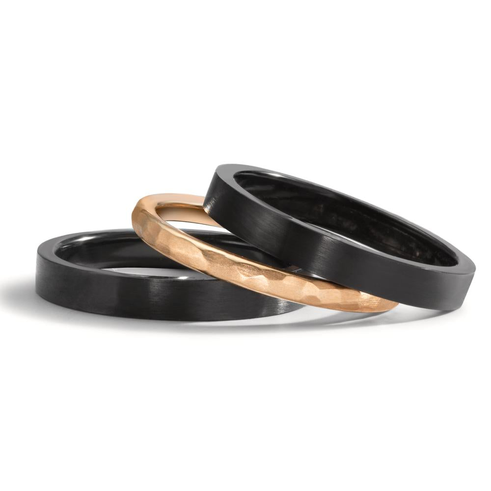 Dieses Damen Ringset besticht durch die elegante Kombination aus mattschwarzem und roségoldfarbenem Design. Die moderne, gehämmerte Oberfläche verleiht den Ringen einen einzigartigen Look. Ideal für stilbewusste Frauen, die trendige Akzente setzen möchten.