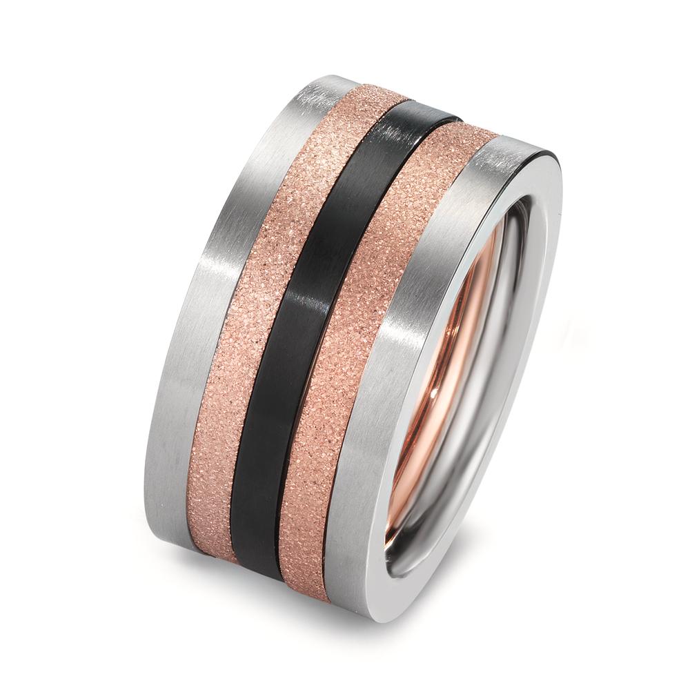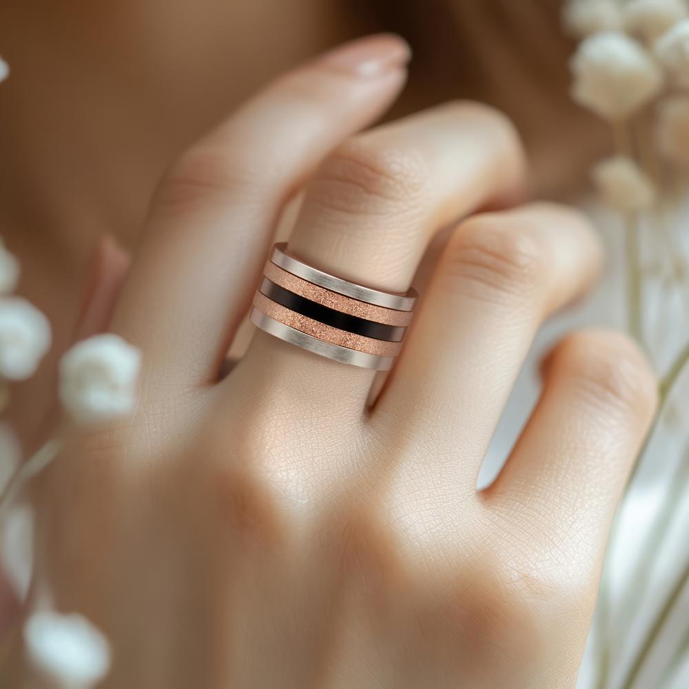 Dieses elegante Damen Ringset besticht durch die Kombination aus mattem Silber, funkelndem Roségold und einem modernen schwarzen Streifen. Die hochwertige Verarbeitung und das breite Design machen es zum perfekten Accessoire für jeden Anlass. Stilvoll und vielseitig.