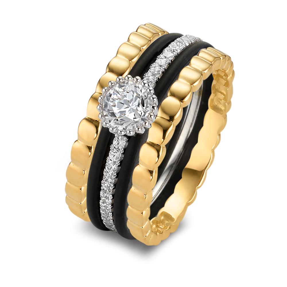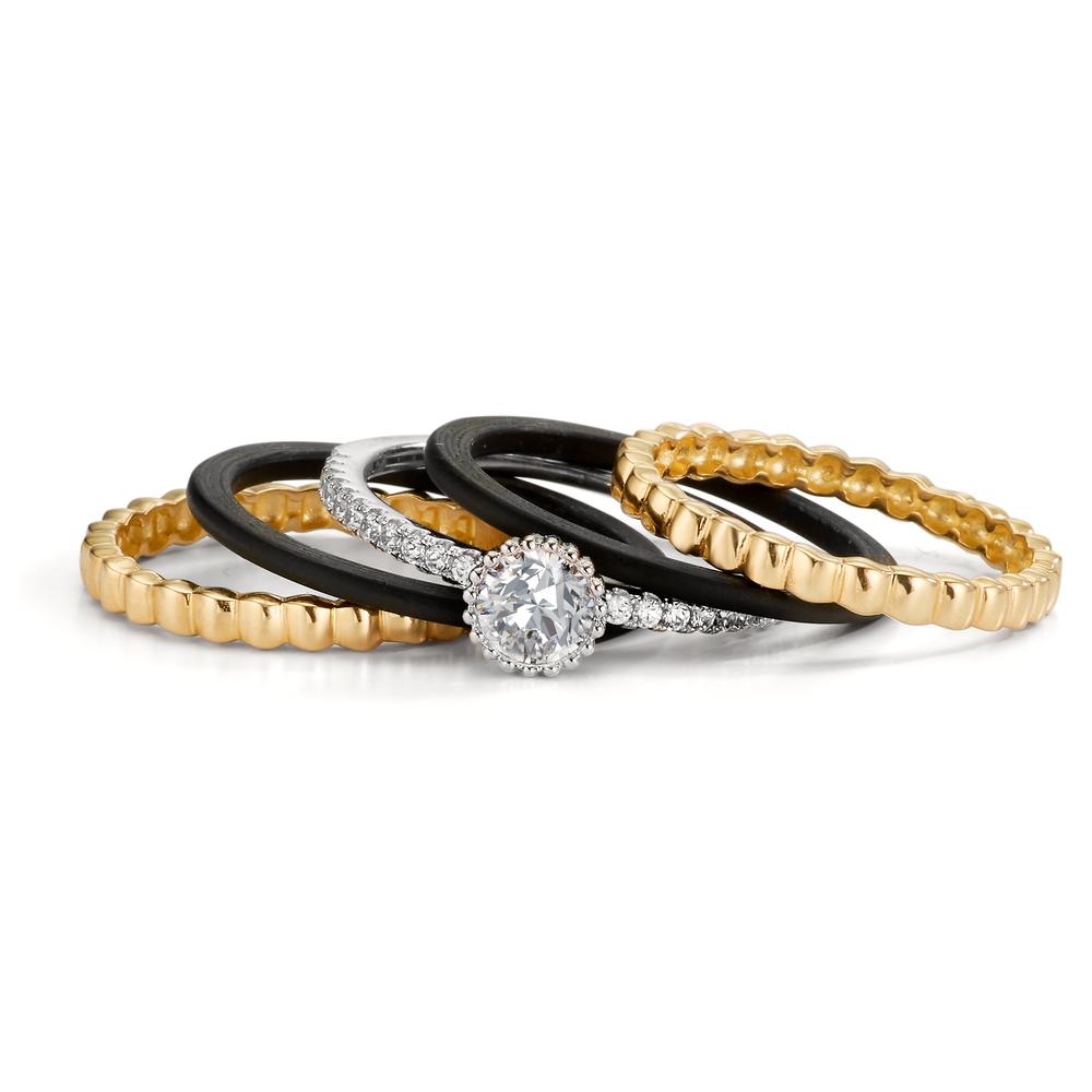 Elegantes Damen Ringset mit funkelnden Zirkonia-Steinen. Die Kombination aus goldfarbenem Design und schwarzen Elementen verleiht dem Set einen modernen und edlen Look. Perfekt für besondere Anlässe oder den Alltag – ein stilvolles Highlight für jede Frau.