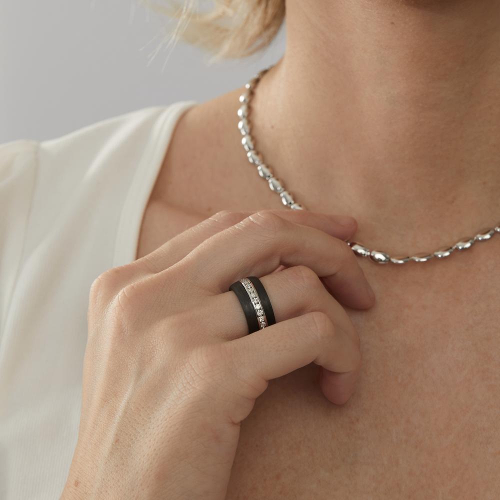 Elegantes Damen Ringset aus 750er Weißgold und Carbon. Der außergewöhnliche Ring besticht durch seine matt-schwarze Carbonoberfläche und eine funkelnde Reihe von Zirkonia-Steinen. Perfekt für moderne und stilbewusste Frauen, die edle Akzente lieben.