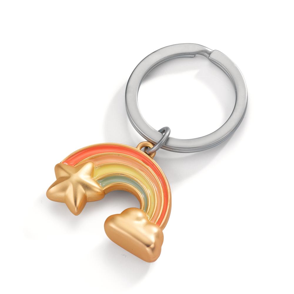 Bunter Schlüsselanhänger aus langlebigem Metall mit einem detailreichen Regenbogen-Design. Die Kombination aus goldfarbenem Stern, Wolke und regenbogenfarbenen Bögen macht ihn zum fröhlichen Accessoire für Ihre Schlüssel. Praktisch und stylisch zugleich!