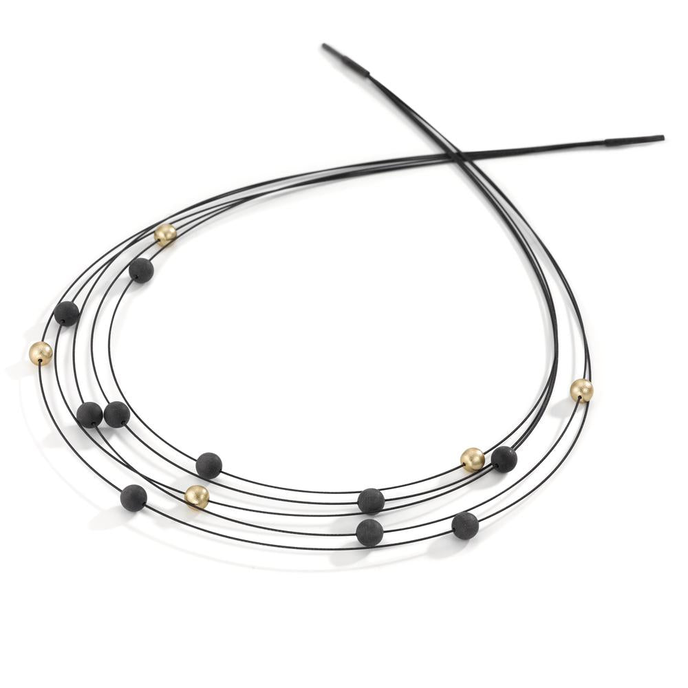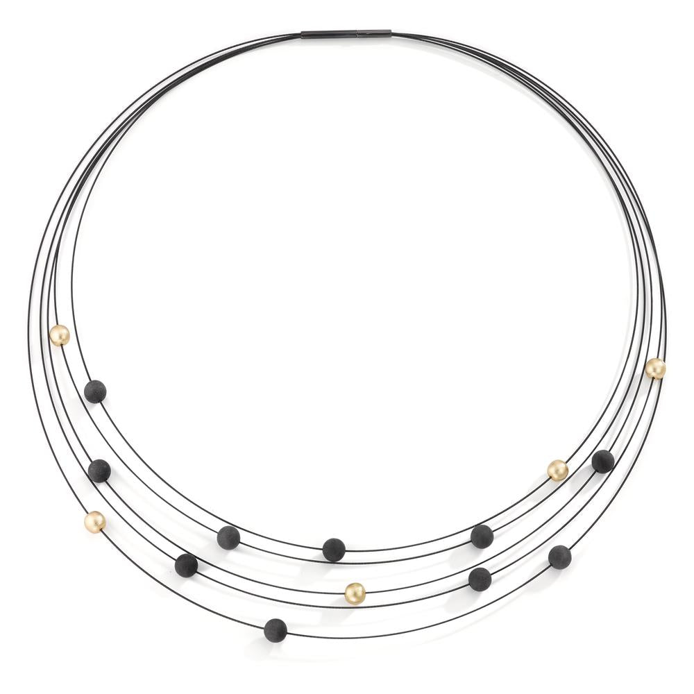 Elegantes Damen-Collier aus hochwertigem Edelstahl mit Carbon- und Aluminium-Elementen. Die filigranen schwarzen Drähte tragen harmonisch angeordnete Kugeln in edlen Gold- und Schwarz-Tönen. Ein moderner, leichter Halsschmuck, der jedes Outfit stilvoll abrundet.