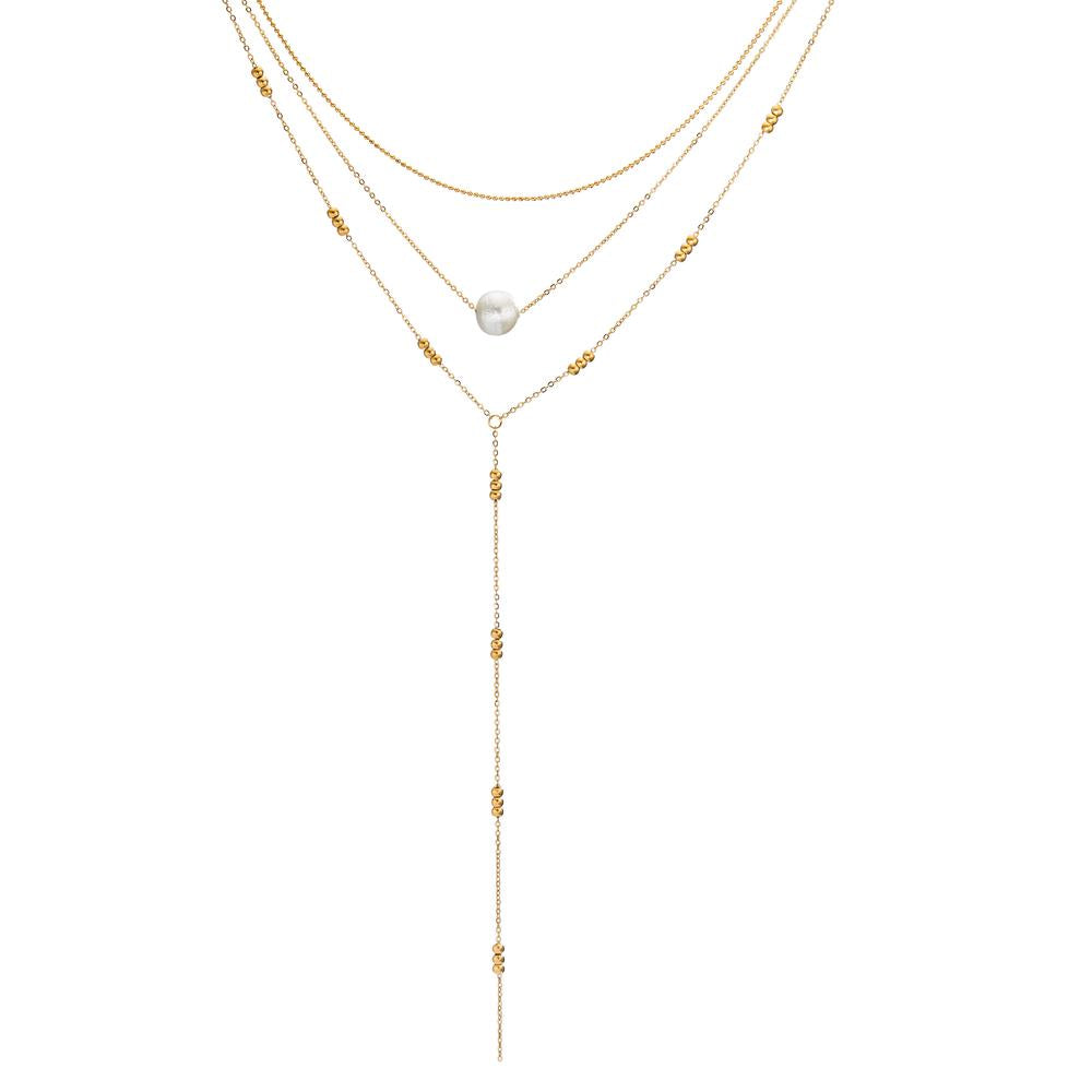 Elegantes Damen-Collier aus hochwertigem Edelstahl in Goldoptik. Mehrreihiges Design mit raffinierter Kettengliederung, verziert mit einer schimmernden Perle. Zeitloser Schmuck, der jedes Outfit stilvoll ergänzt – ideal für besondere Anlässe und den Alltag.